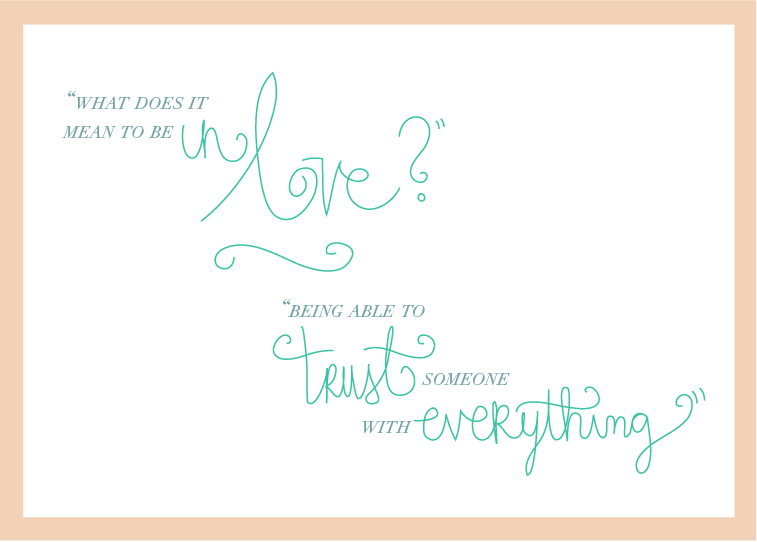 The idea of “love” was pretty scary to me. Whenever I thought I might love Nate, I shook my head and told myself it was too early for that. I didn’t know how to be in love! And, wait, I thought love wasn’t supposed to happen for a long time. And that we were supposed to know each other really, really, really well… and that I had to have all his favorite things memorized before I could fall in love with him. Because that’s how it’s “supposed” to go… But once that feeling had been felt, I couldn’t not tell him about it. I mean, we were dating! And if you’re dating and you love the person, you should probably tell them, right?